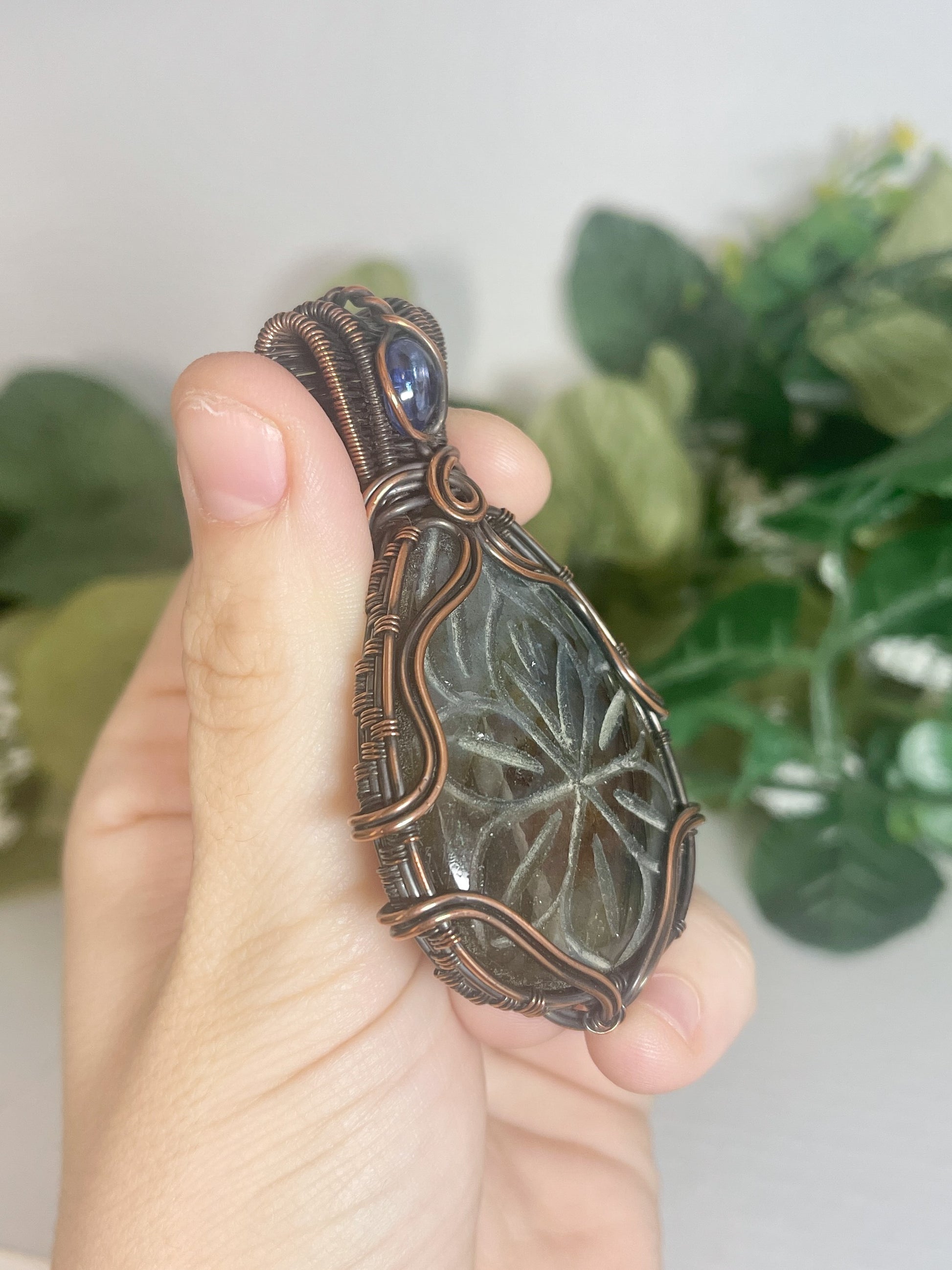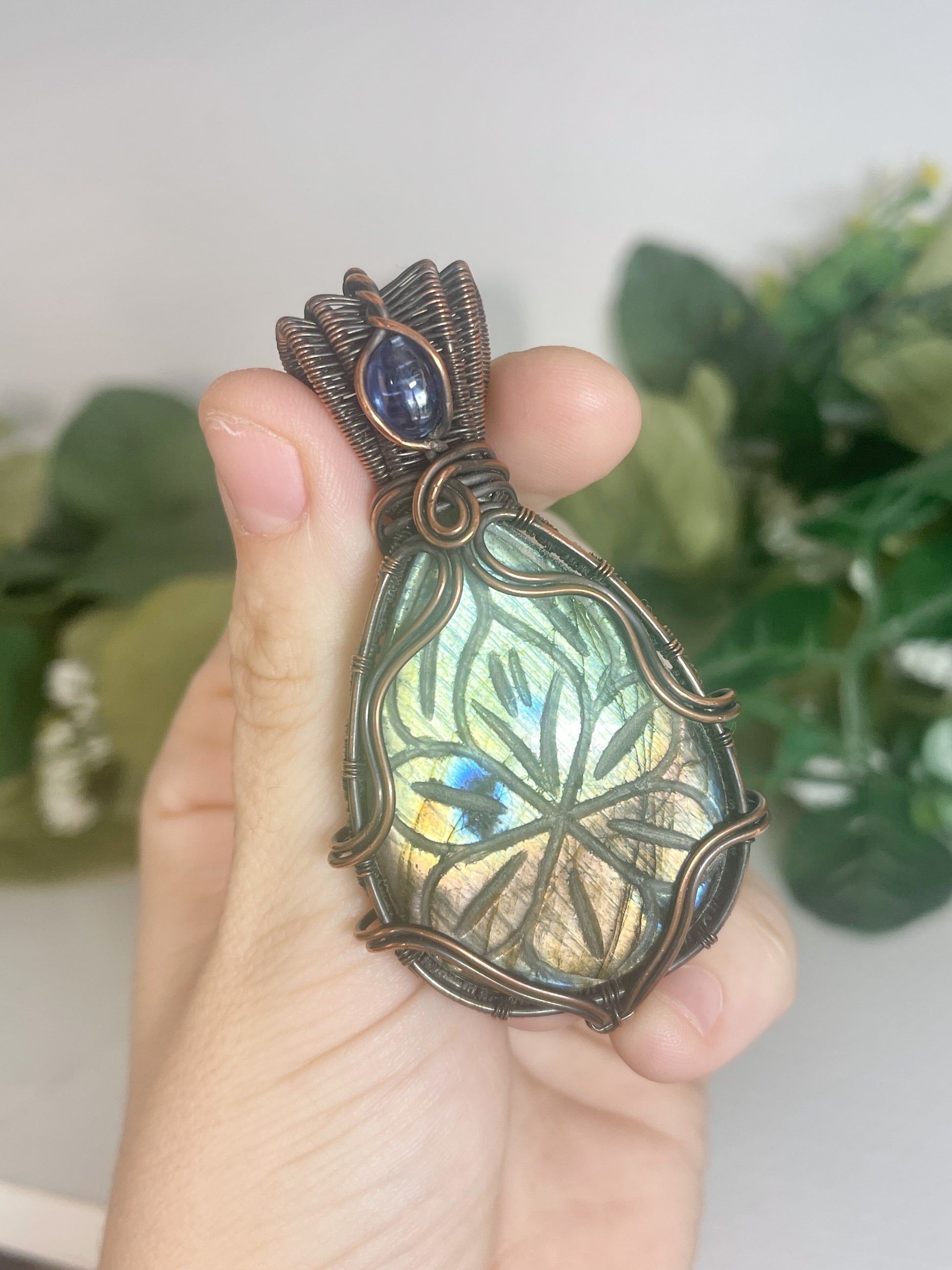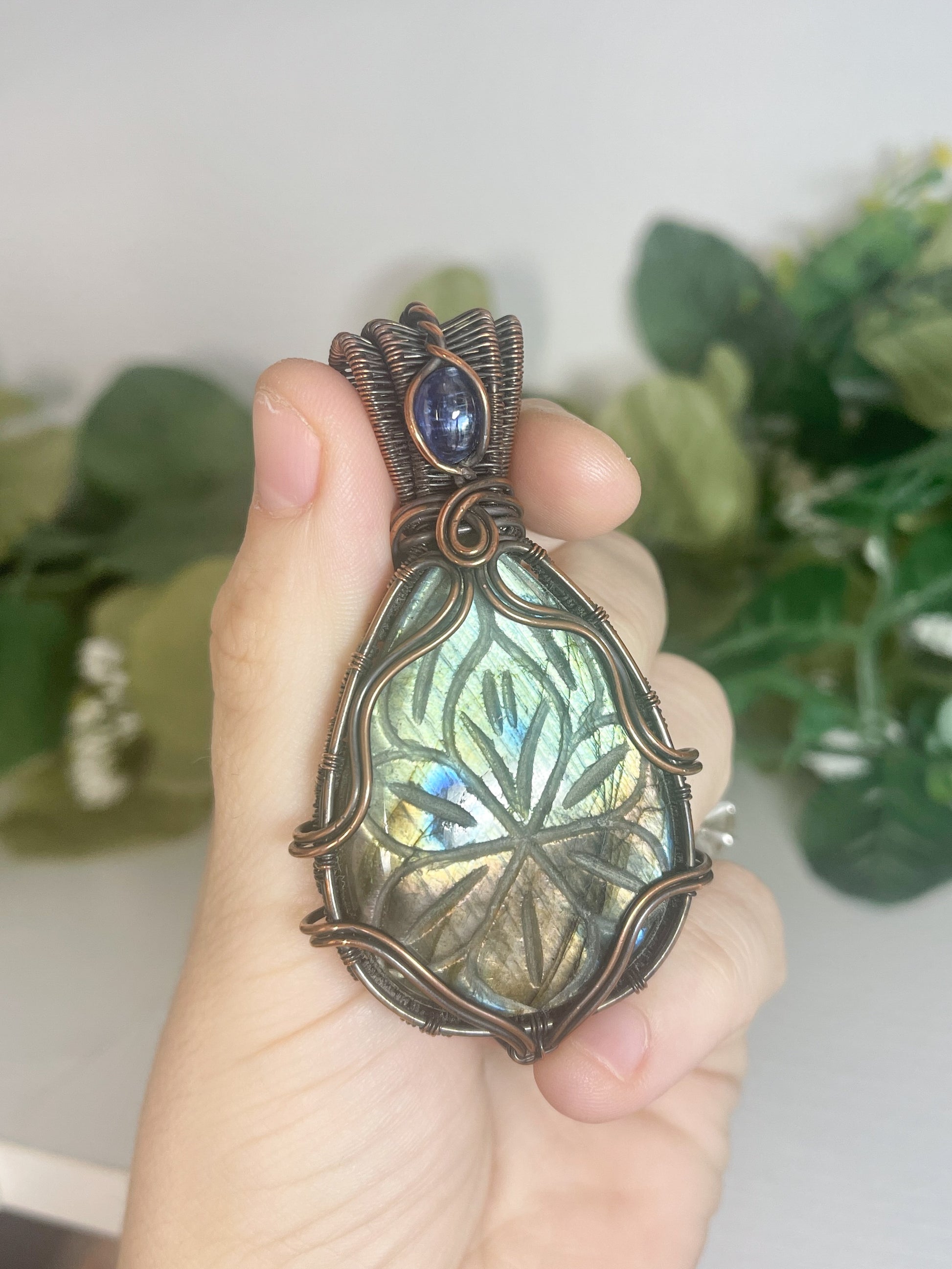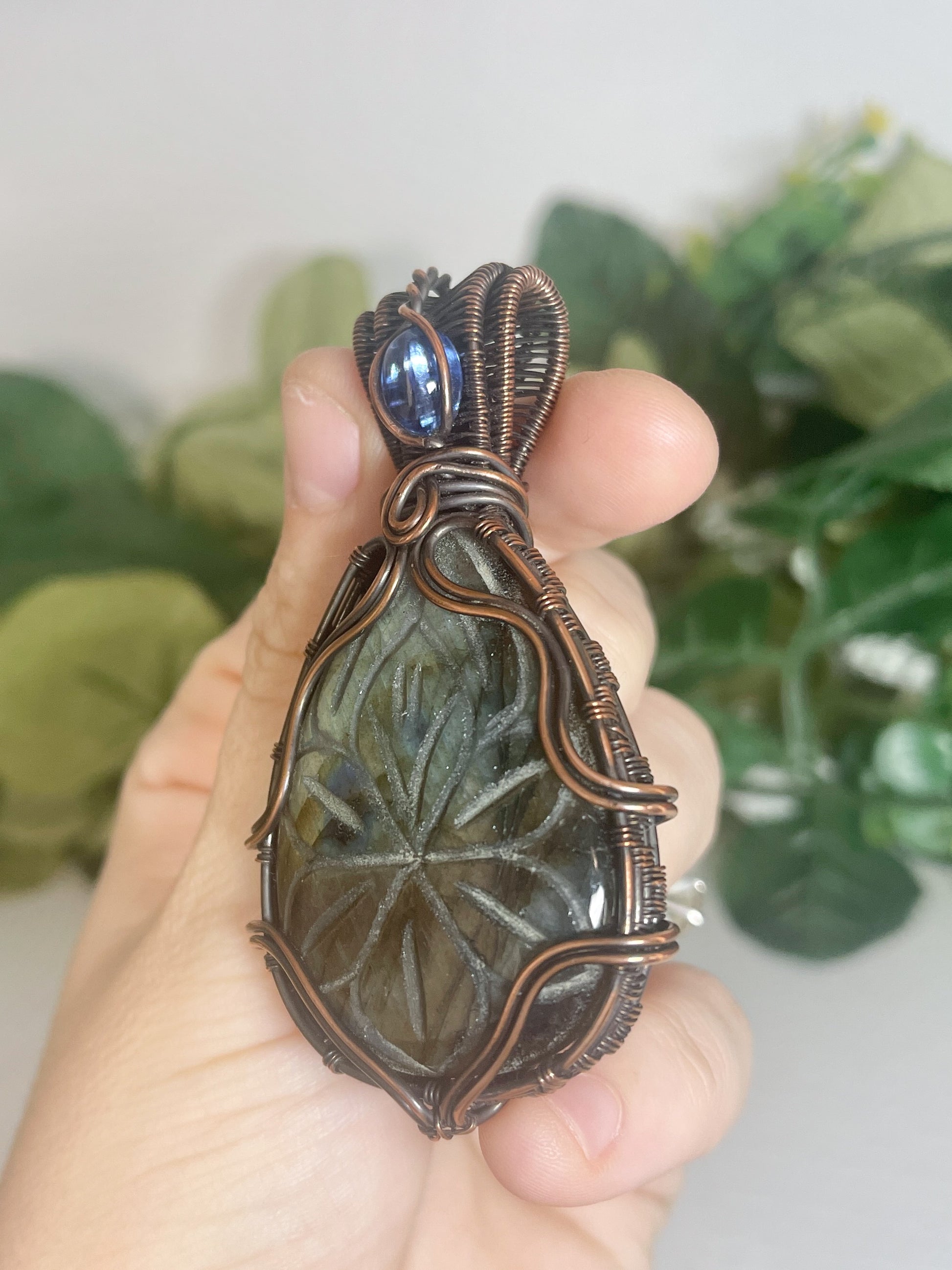 this gorgeous, gorgeous carved labradorite is one i’ve been hanging onto for awhile. i wrapped it up and paired it with a gorgeous kyanite to make the blue in the lab pop, and wow. she is powerful. comes on a copper chain