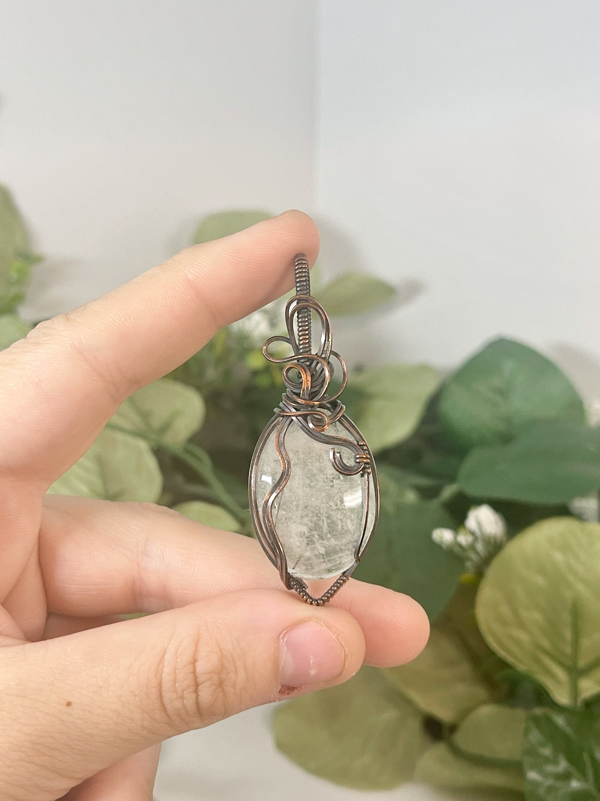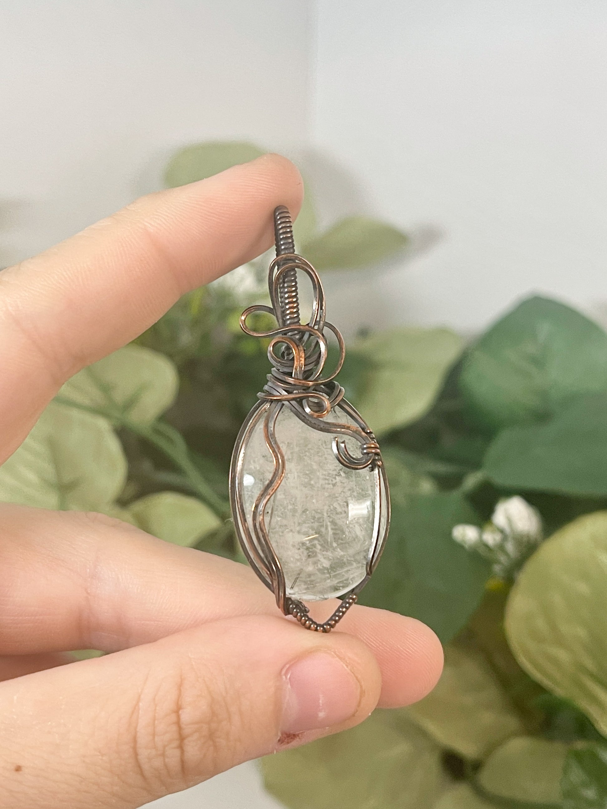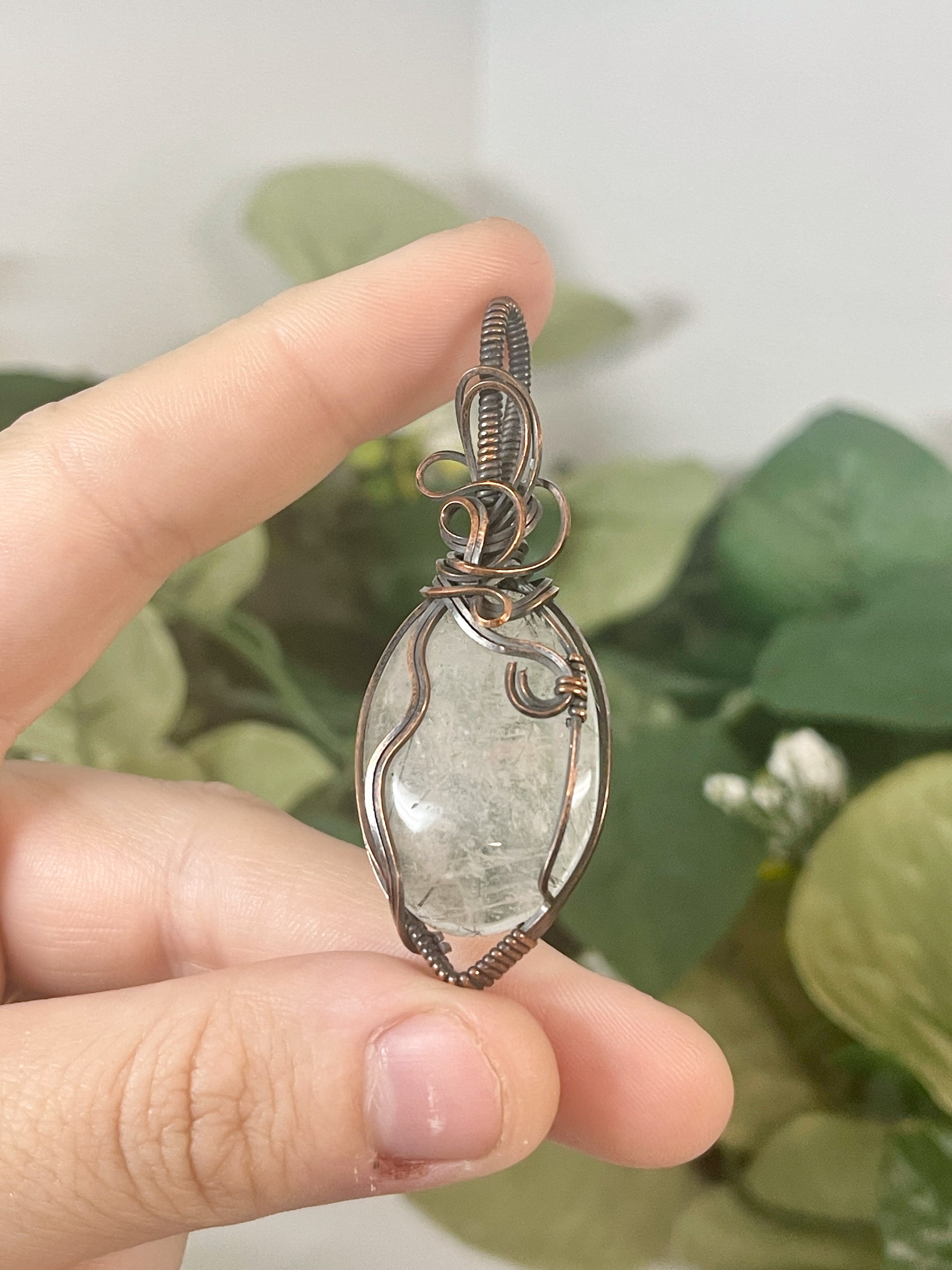 this unique black tourmalinated quartz is delectable and cute, wrapped with some fun swirls up top. comes on a free black cord or you can upgrade to a copper chain by adding it to your cart.