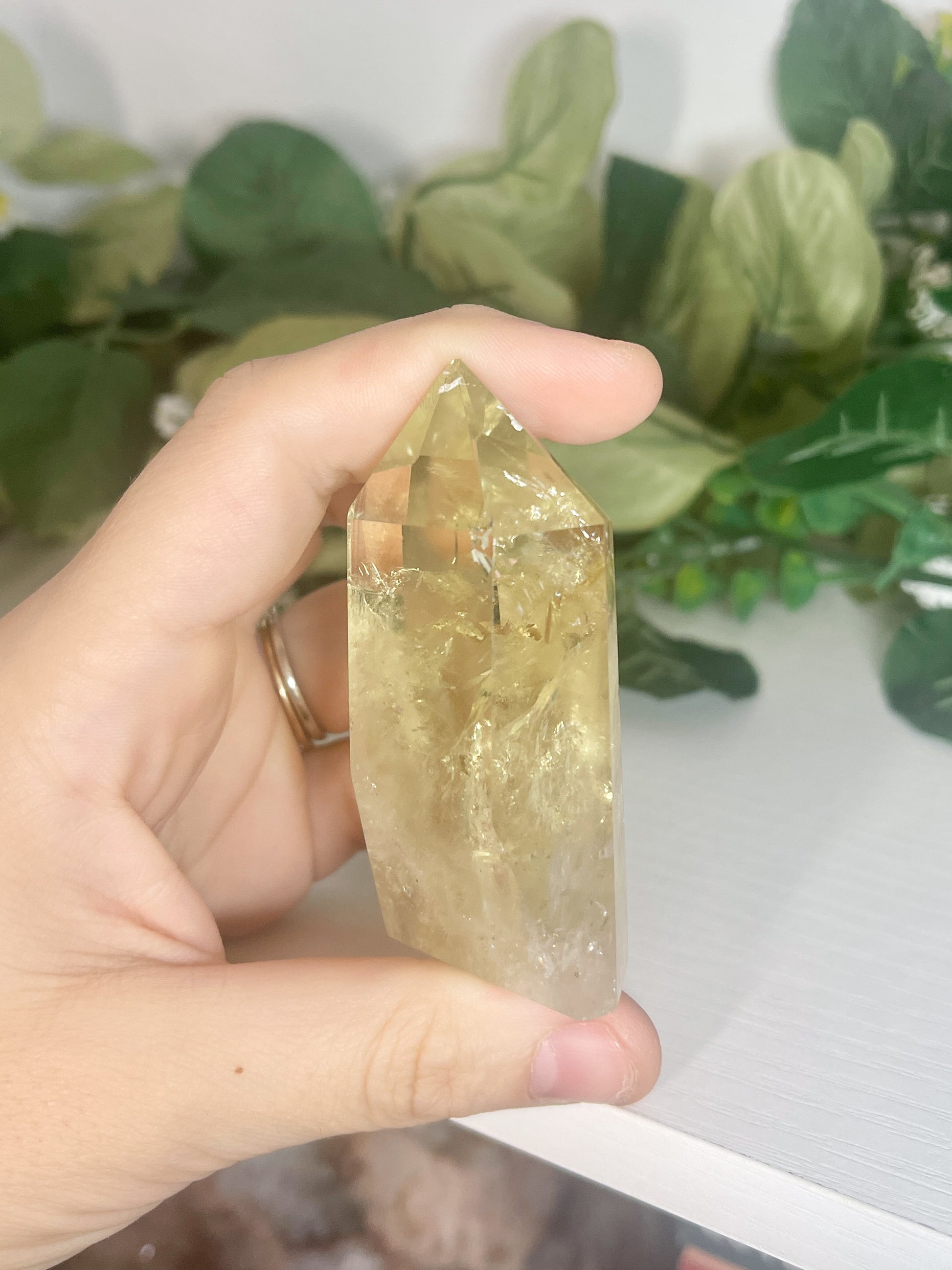 this gorgeous citrine is the highest quality i have ever had the pleasure of carrying. this specific tower sits at 3 ounces, 2 3/4 inches tall and 1 1/2 inches wide. it’s the chunkiest of the 3 i have available.