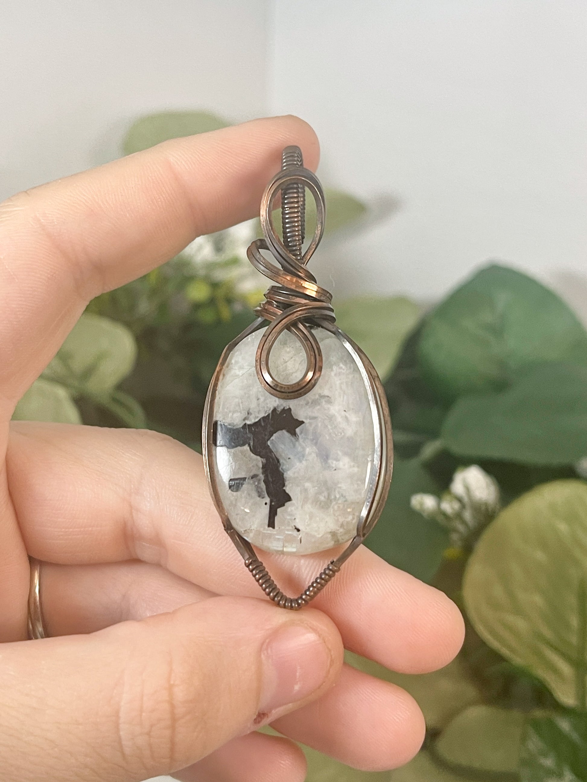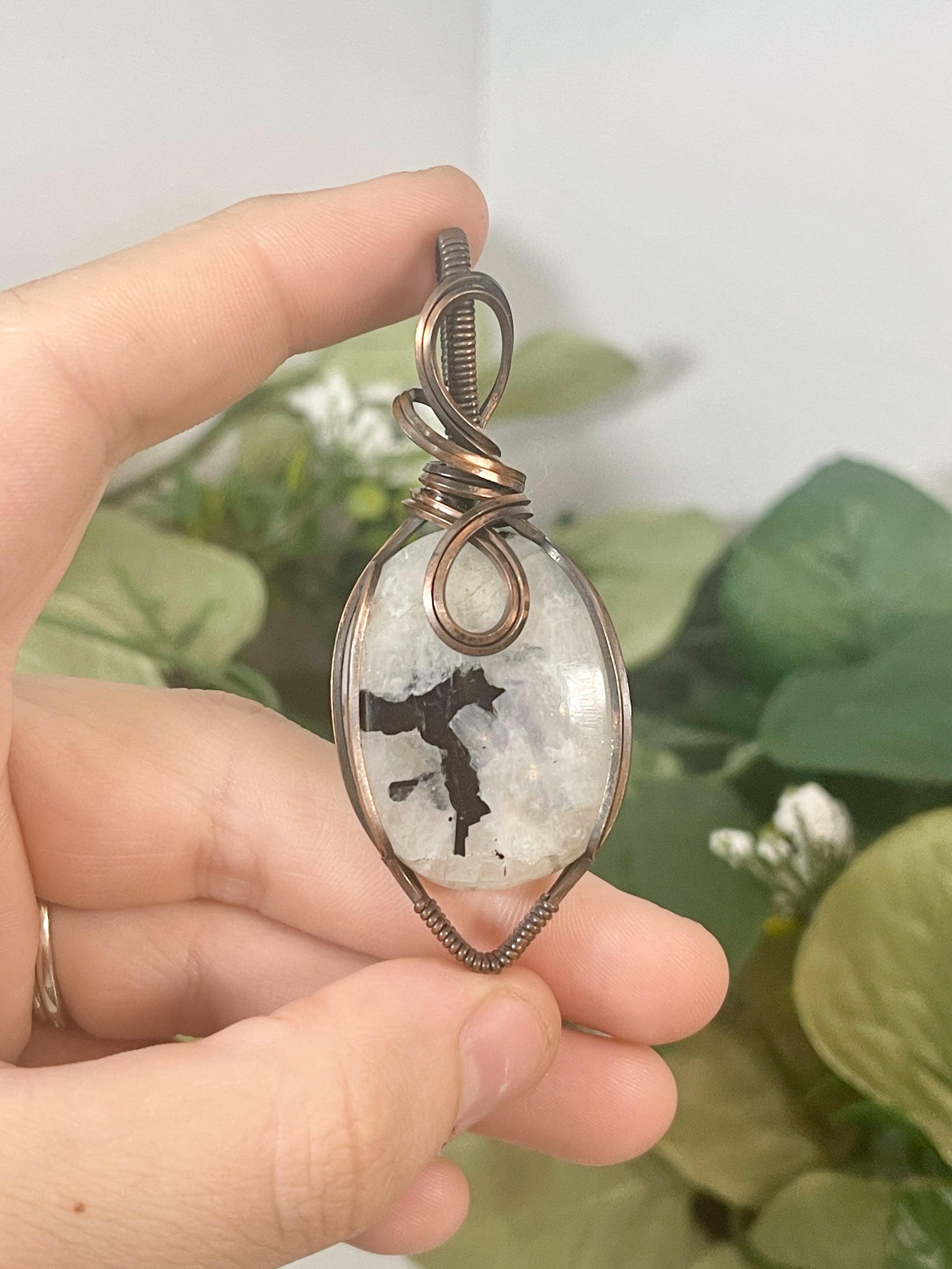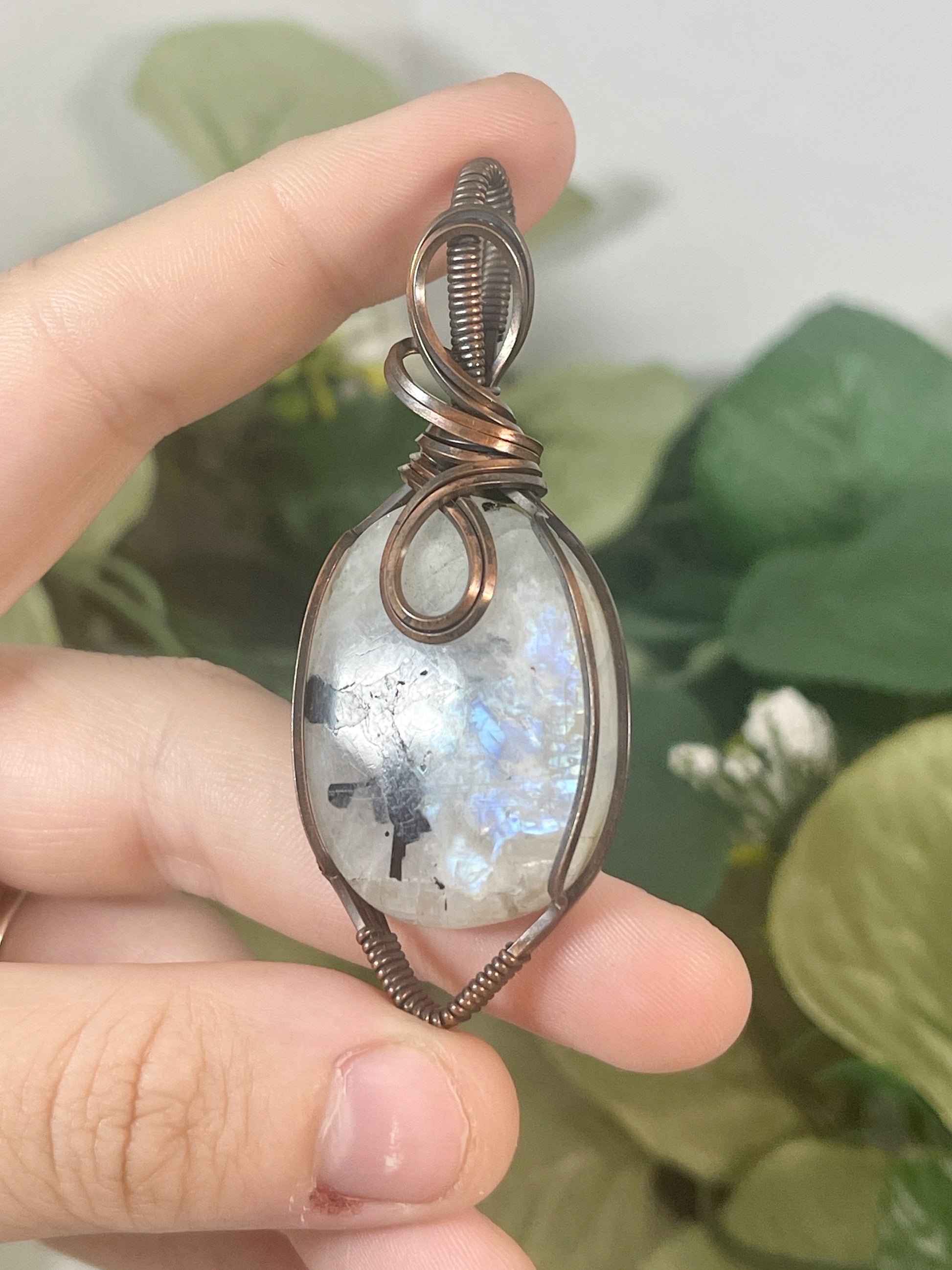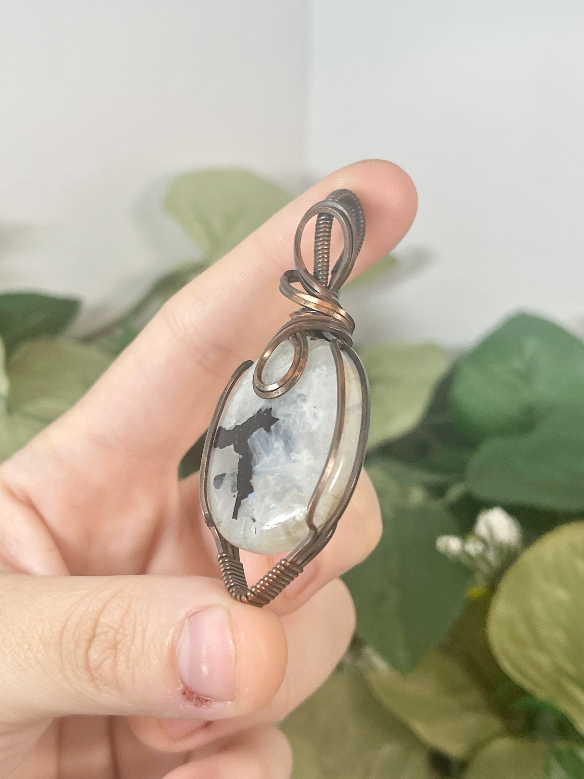this unique moonstone is wrapped in oxidized copper and comes on a free back cord, but you can upgrade to a copper chain by adding it into your cart.