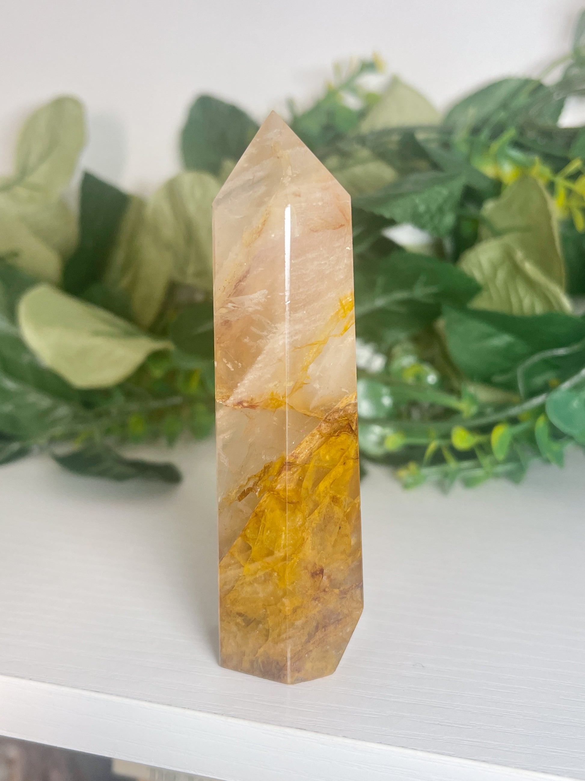 these gorgeous fire quartz towers are yellow, orange, and red in all the right places. this one sits at 4.3 ounces and 4 inches tall by 1 inch wide.