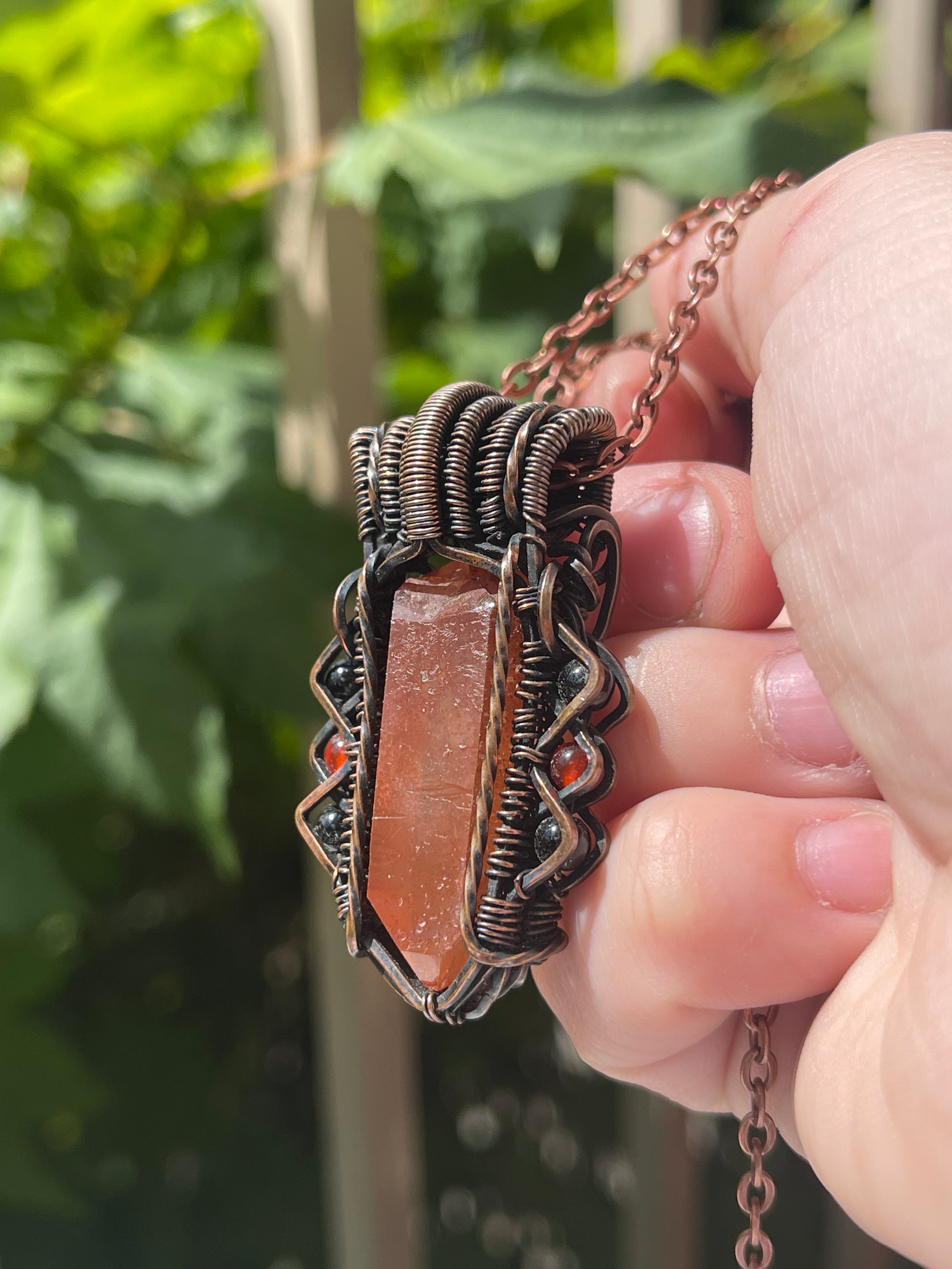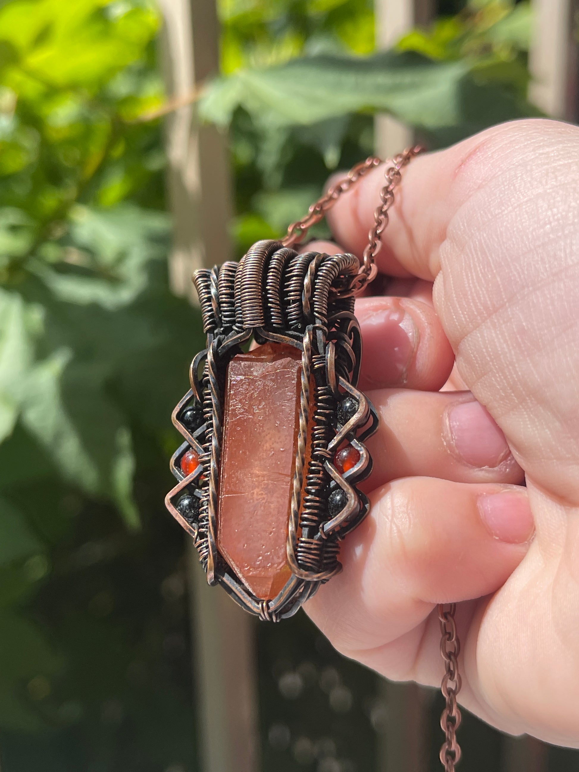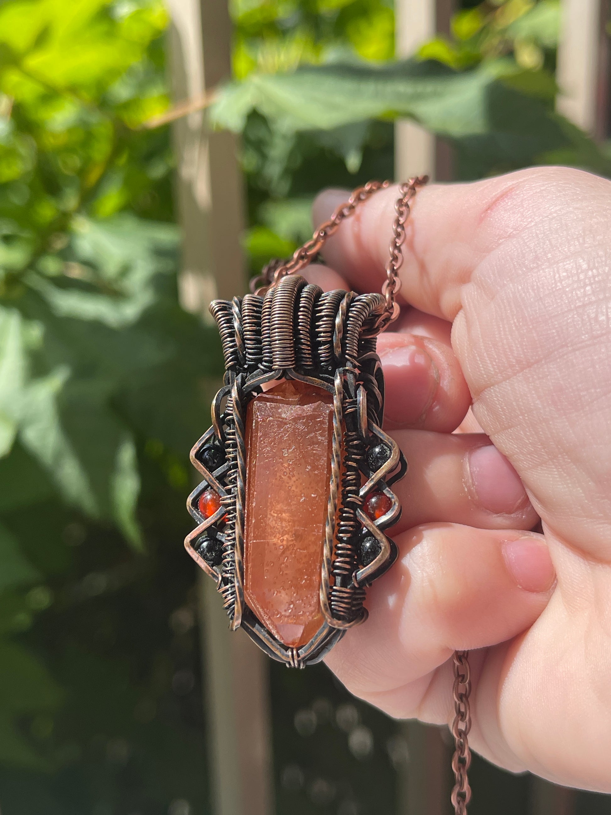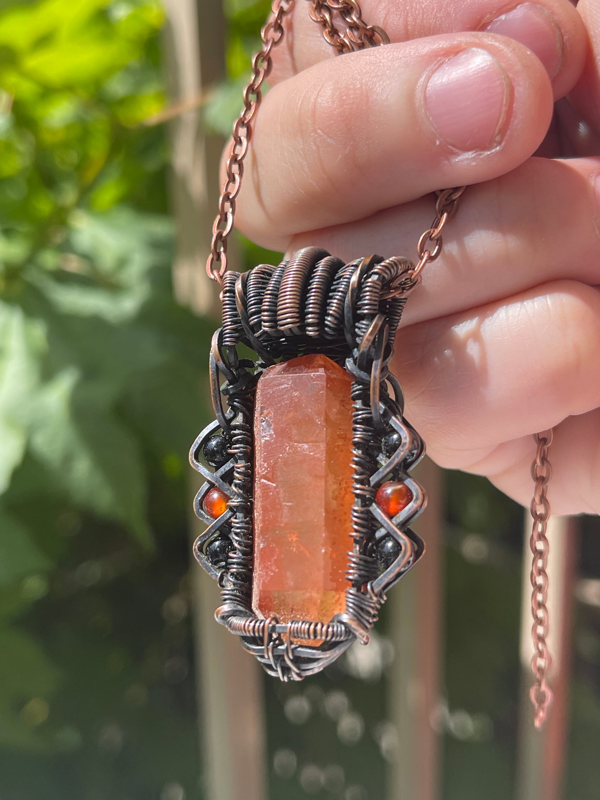 This unique raw tangerine quartz point is paired with 2 carnelian beads and 4 black onyx beads, it is wrapped in oxidized copper. Comes on an 18 inch black cord with clasp.