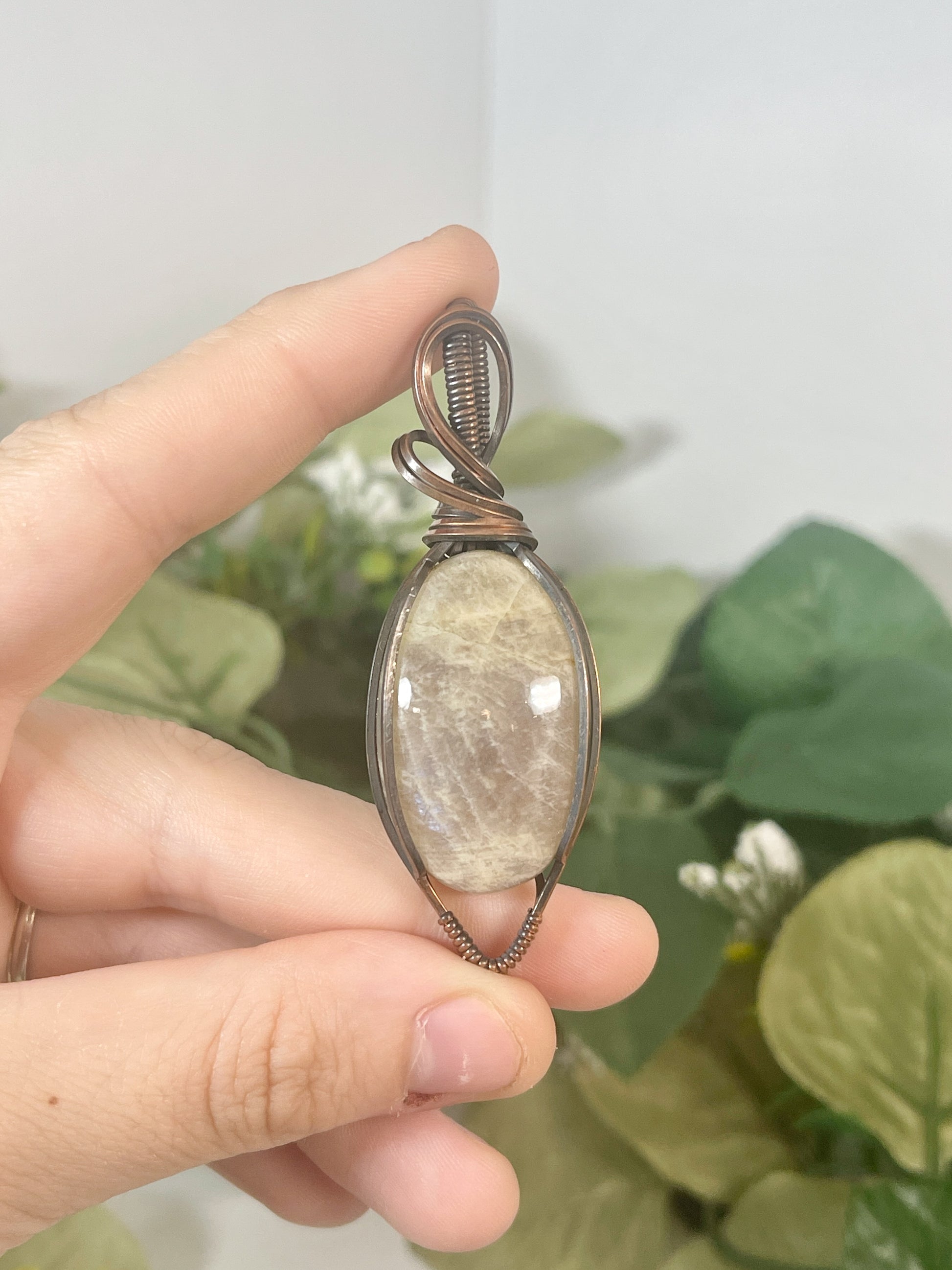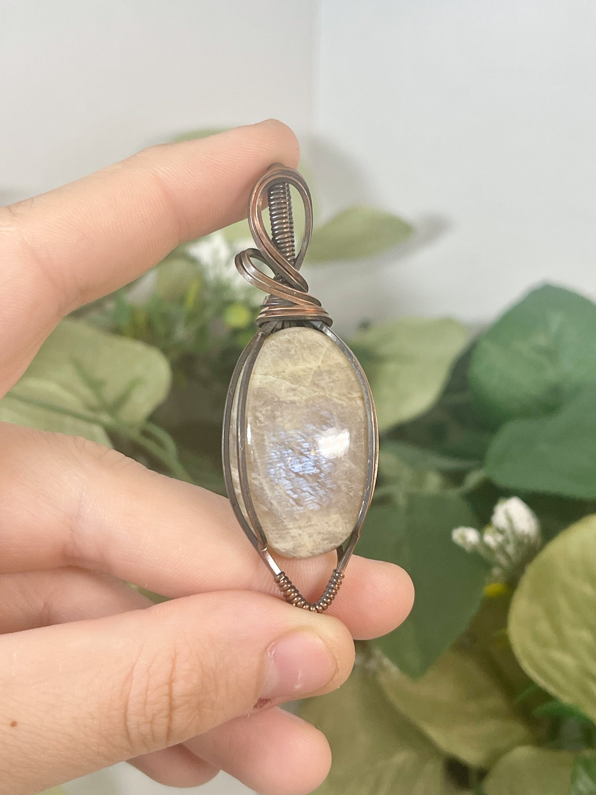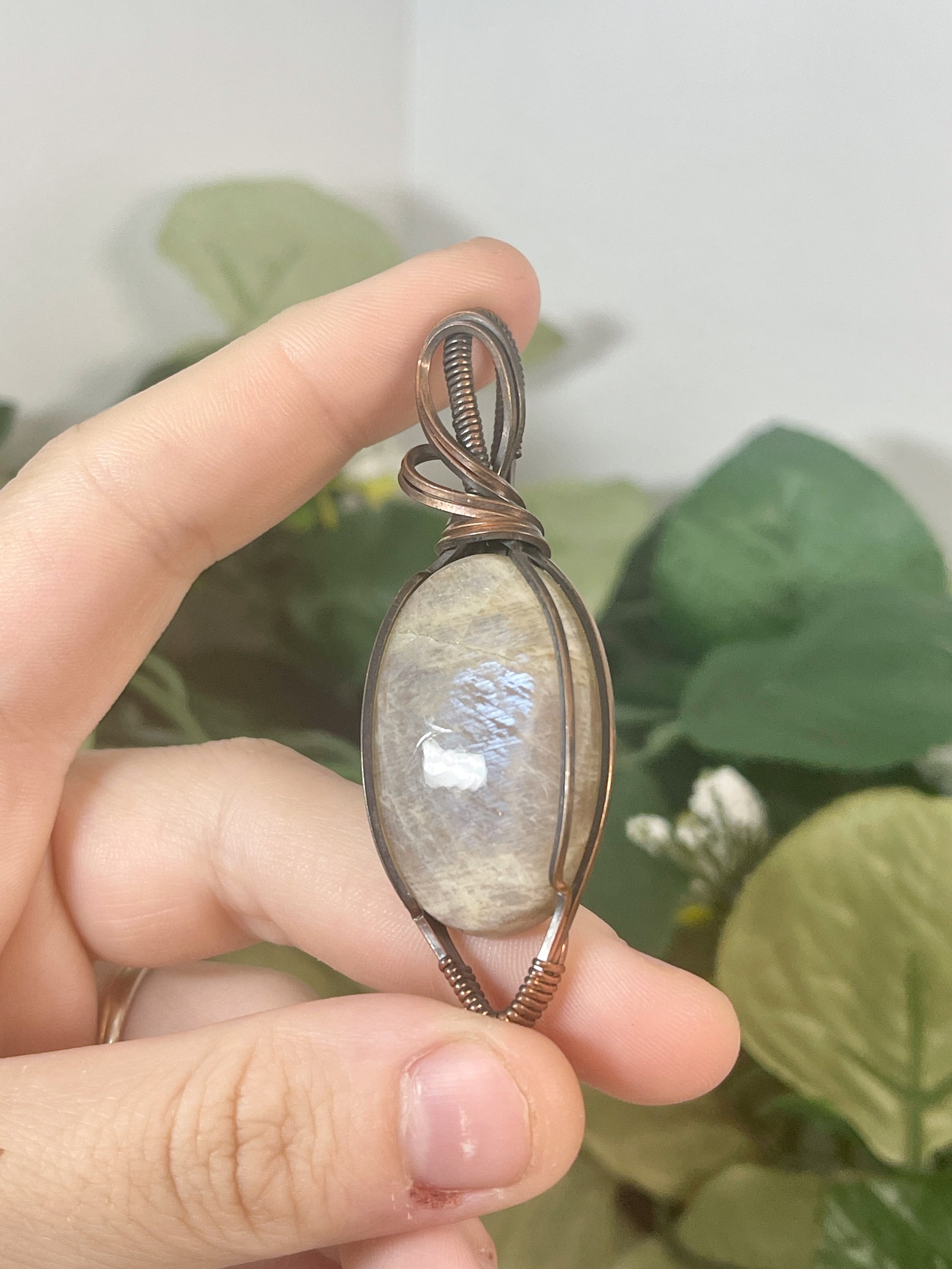 this super cute sunstone in moonstone cabachon is wrapped in oxidized copper. comes on a free black cord or you can upgrade to a copper chain by adding it to your cart.