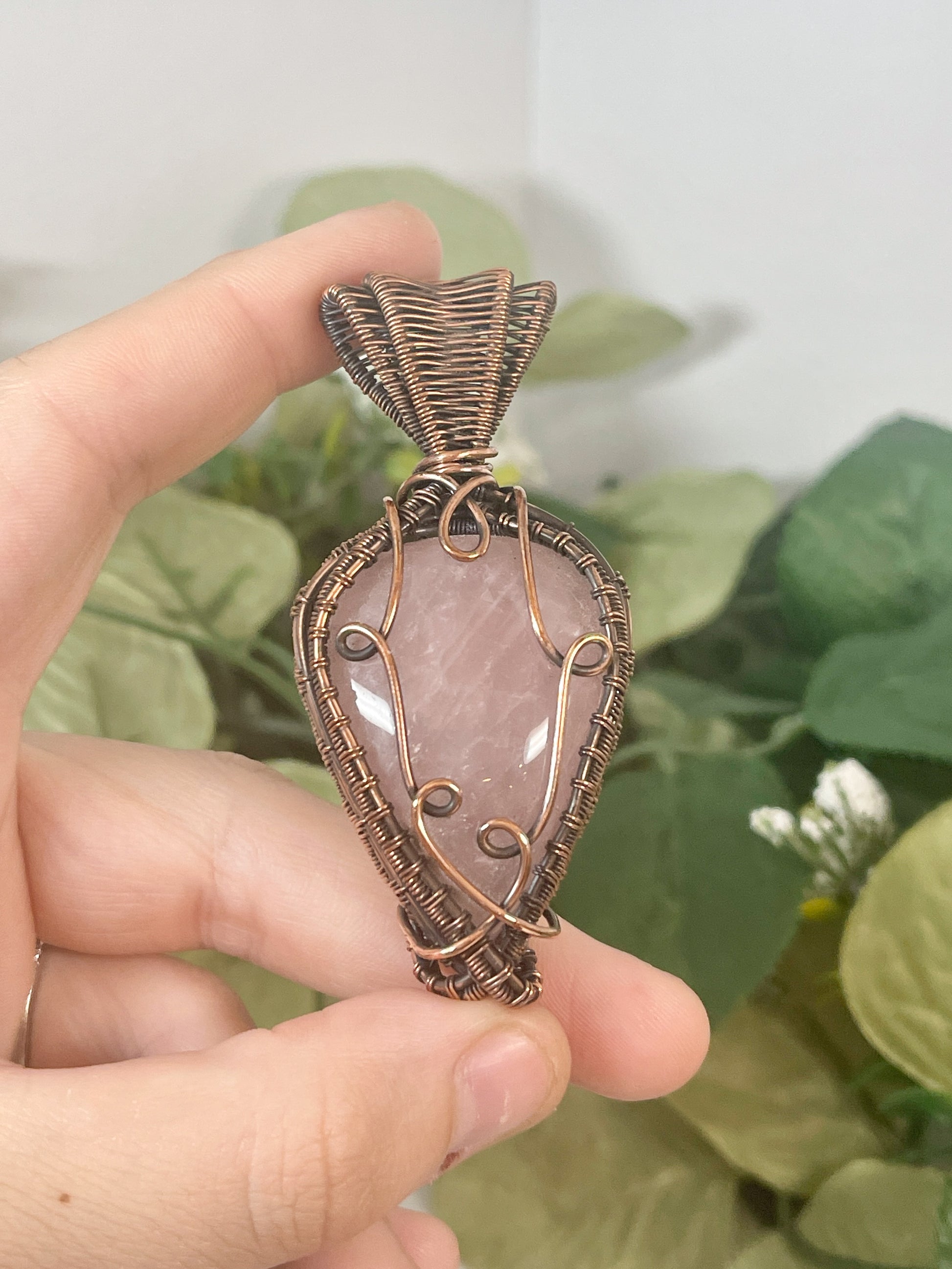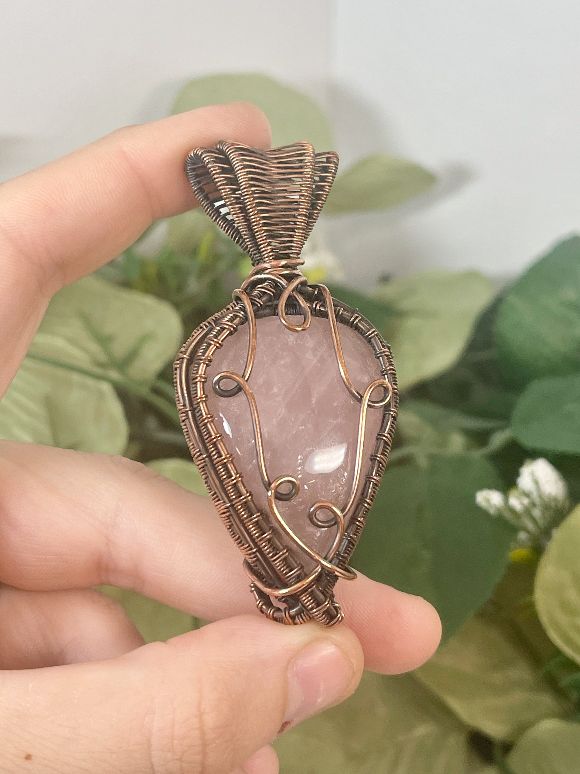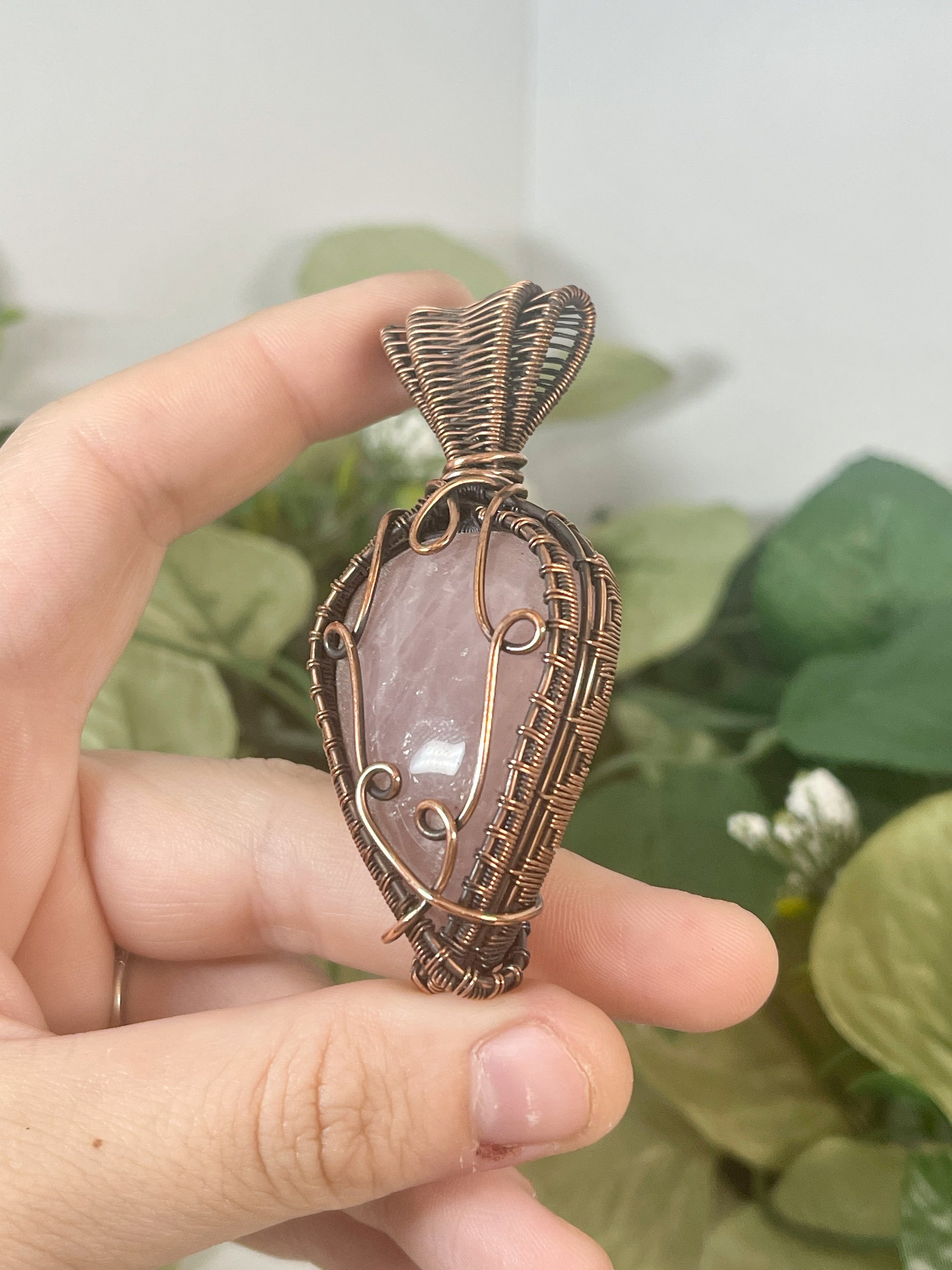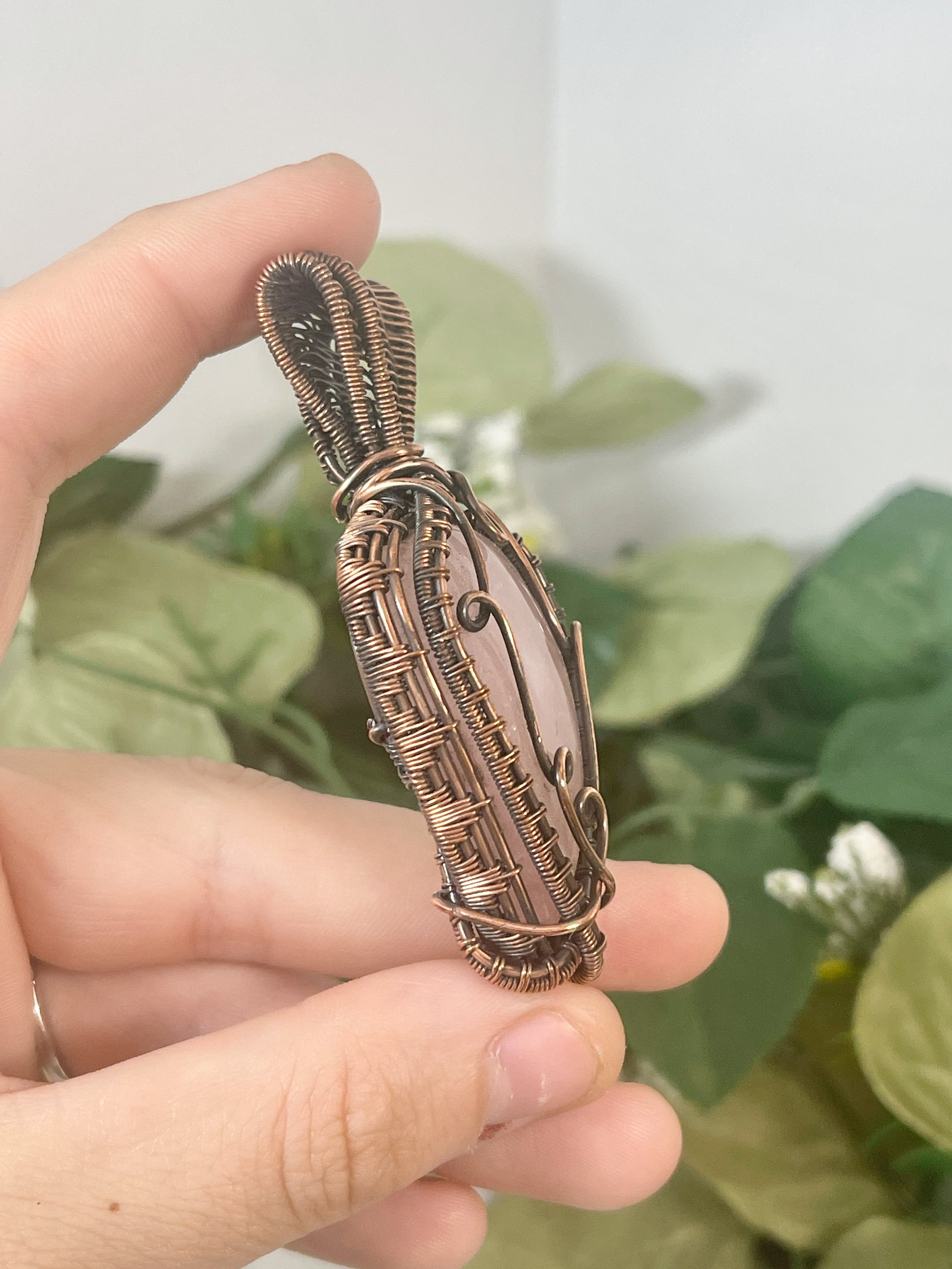 This unique and chunky Rose Quartz is wrapped in oxidized copper. Comes on an 18 inch black cord with clasp.