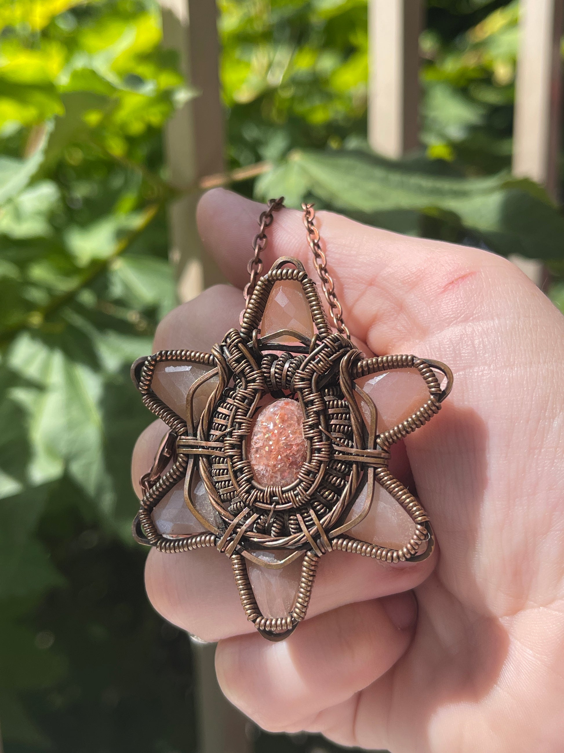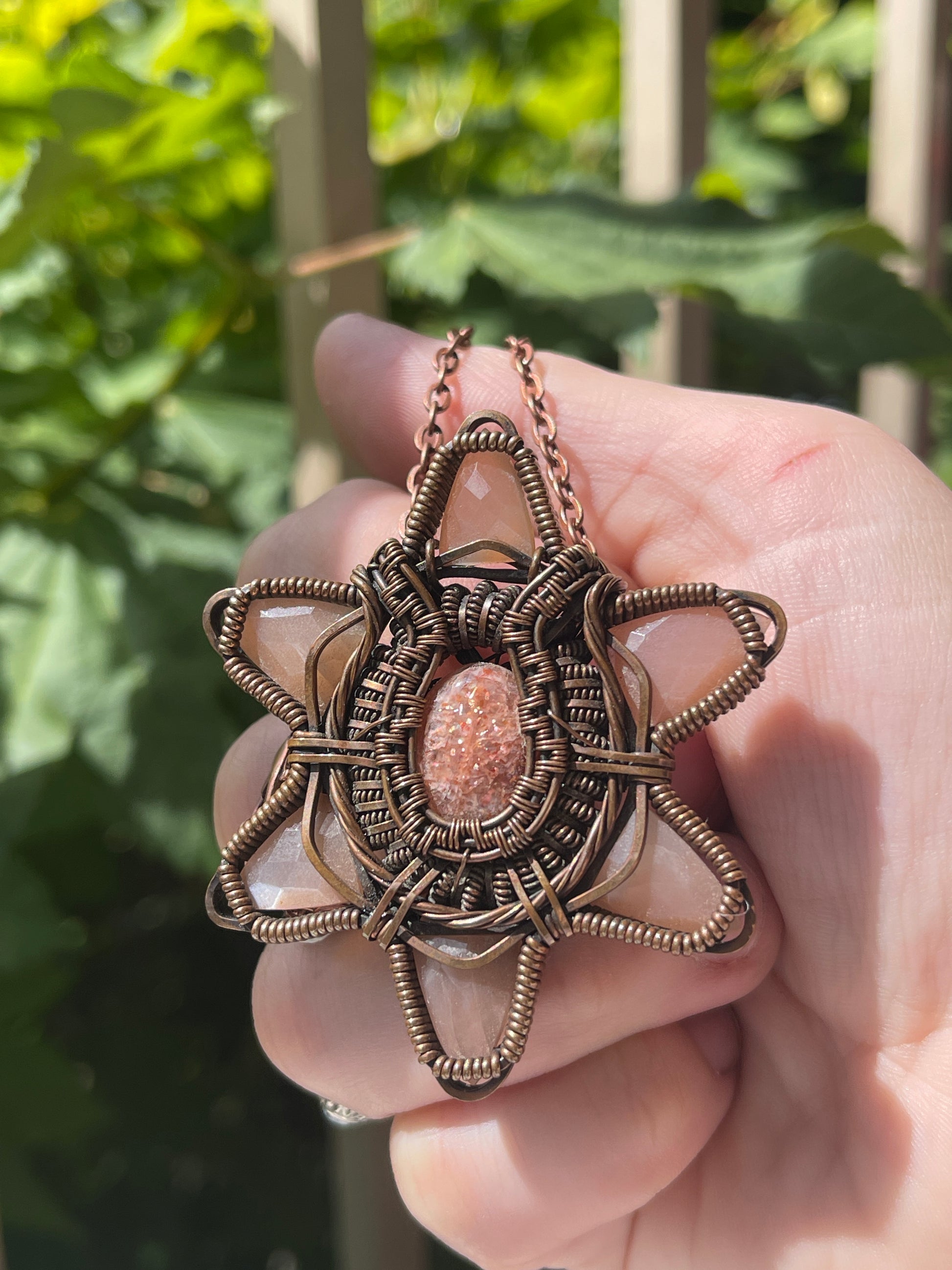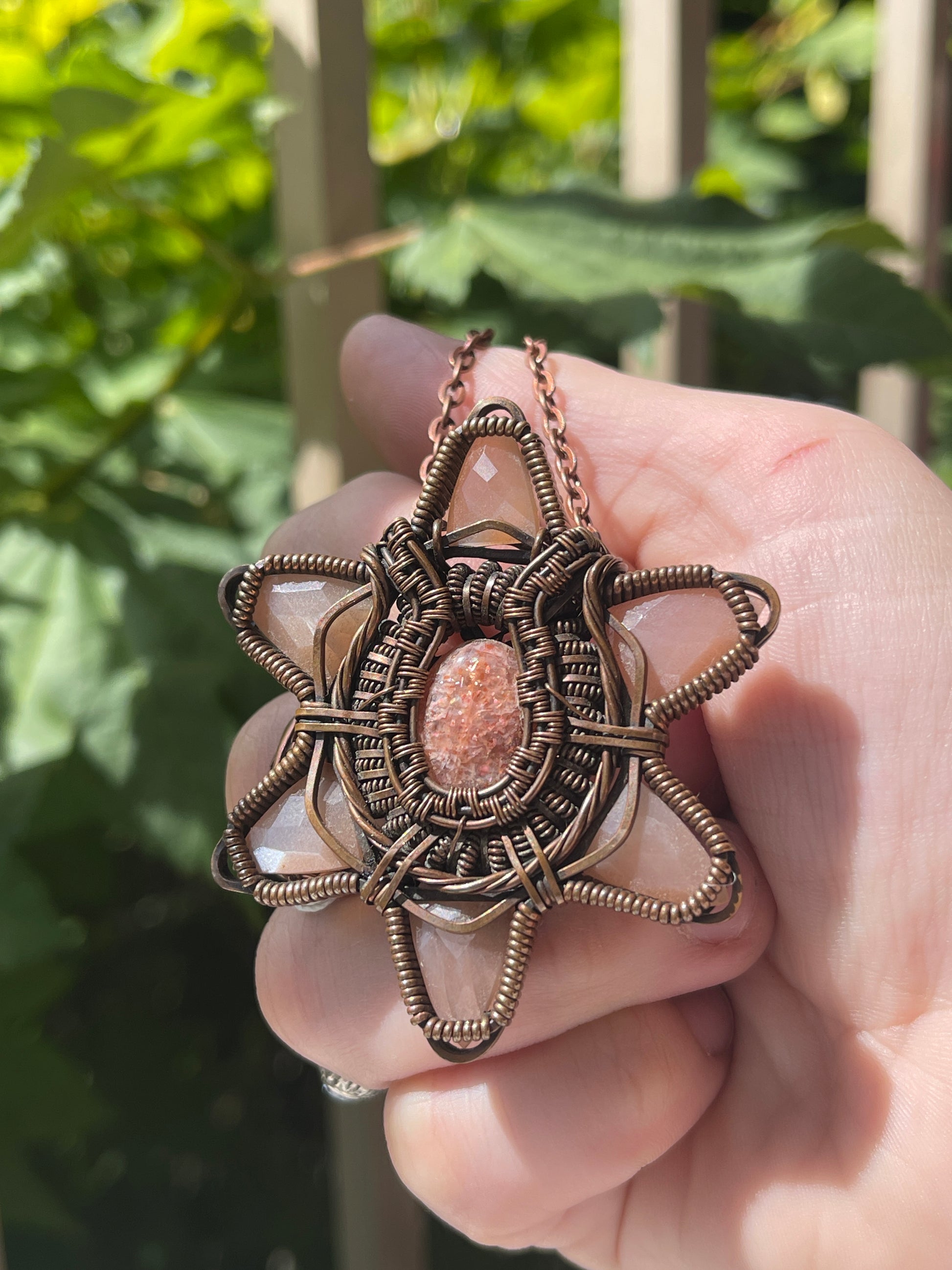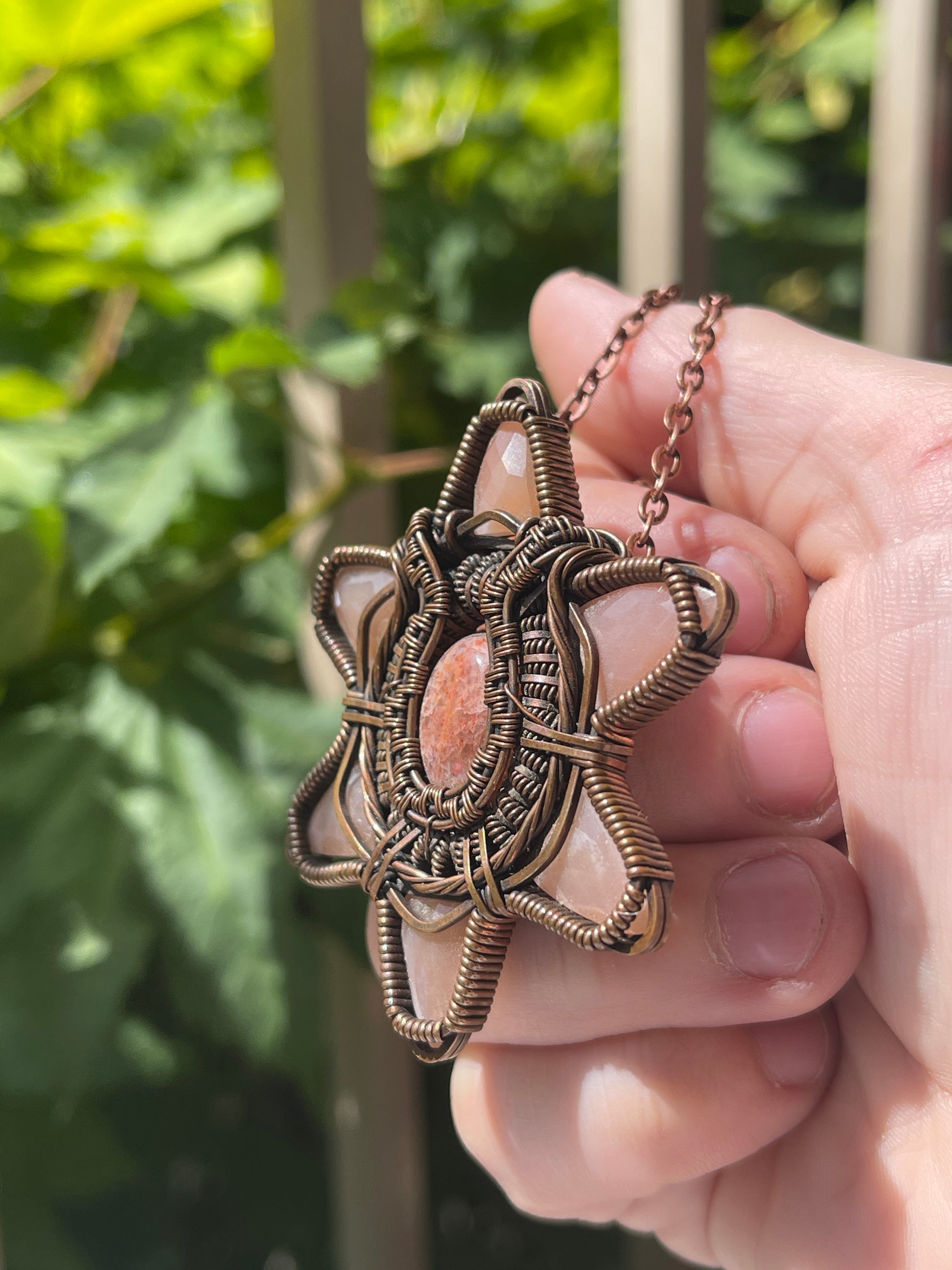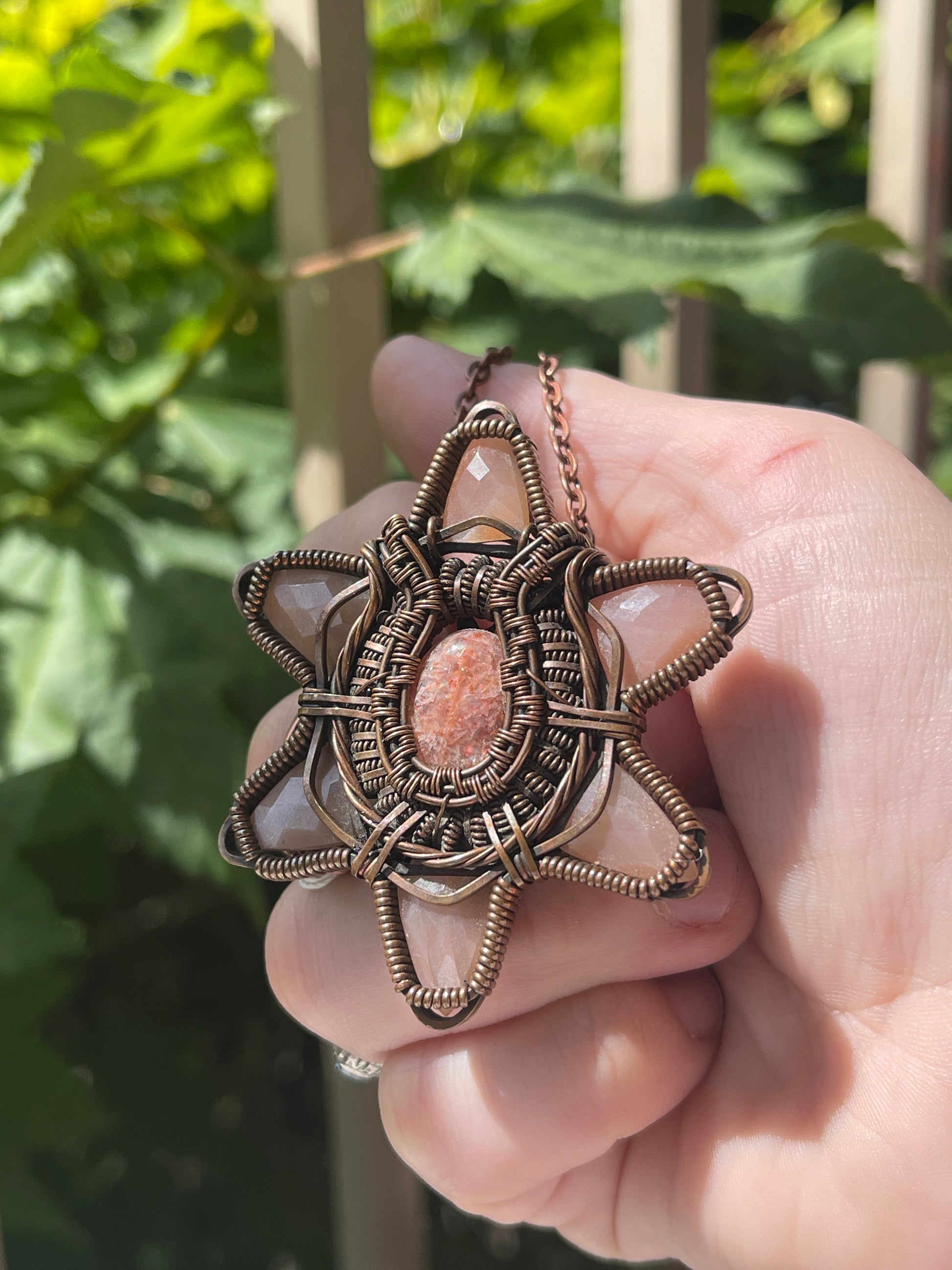 This unique sunstone cab is paired with 6 peach sunstone cabochons and is wrapped in oxidized copper. Comes on an 18 inch black cord with clasp.