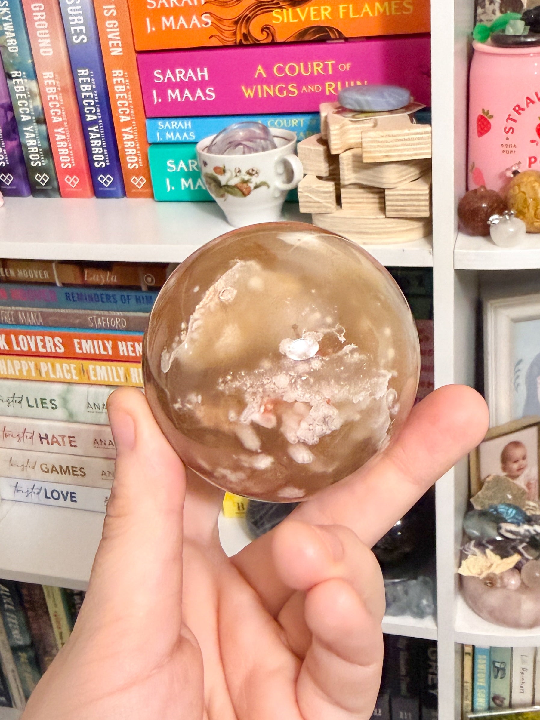 this super cute flower agates sphere has the usually pinks and yellows but also has a gorgeous bunch of tan inclusions. it sits at 12.2 ounces and is 2.5 inches in diameter.