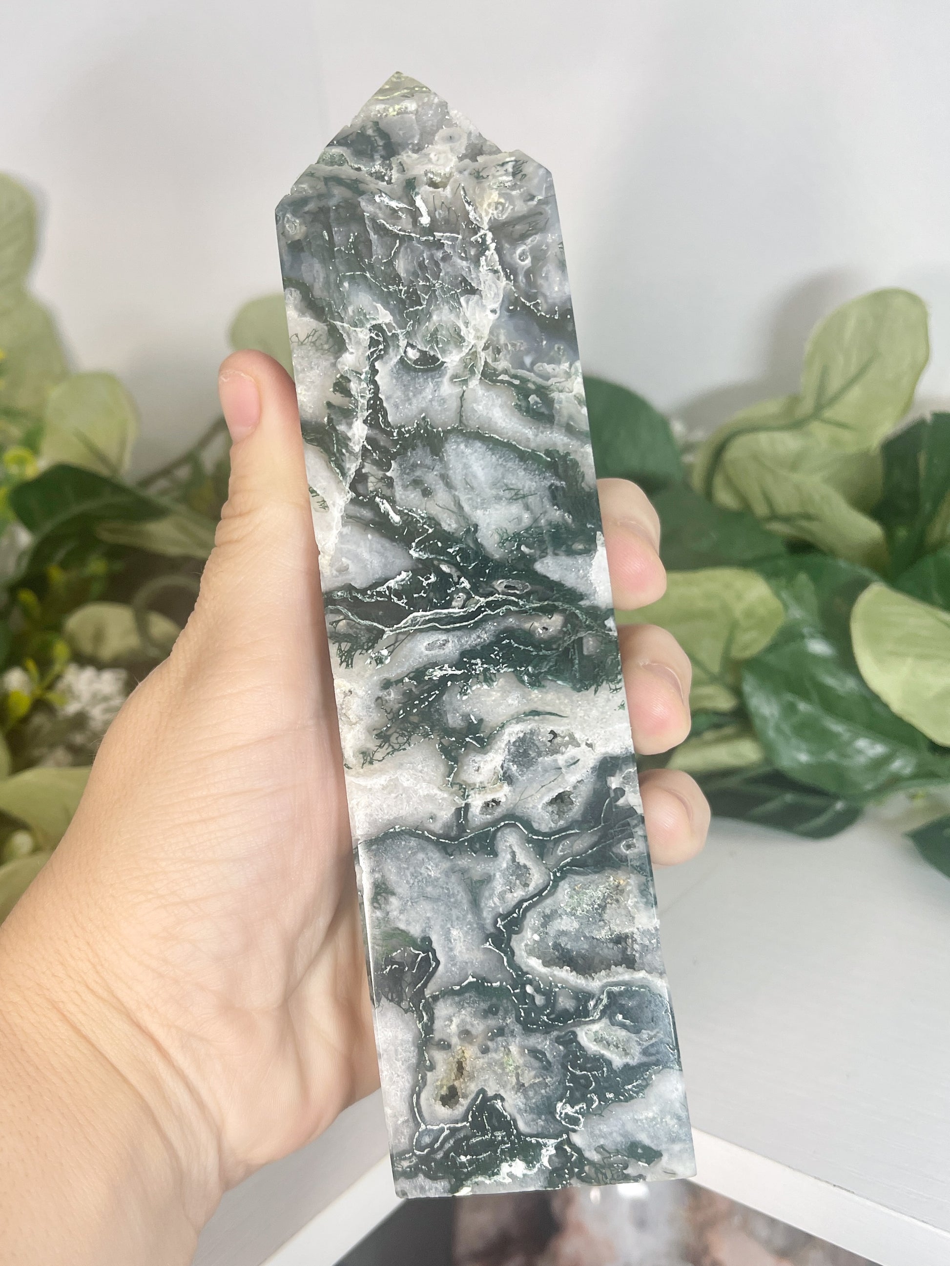 this moss agate tower is one of the most gorgeous i’ve carried. it has the deepest greens i have ever seen, a few druzy caves, and a ton of personality.