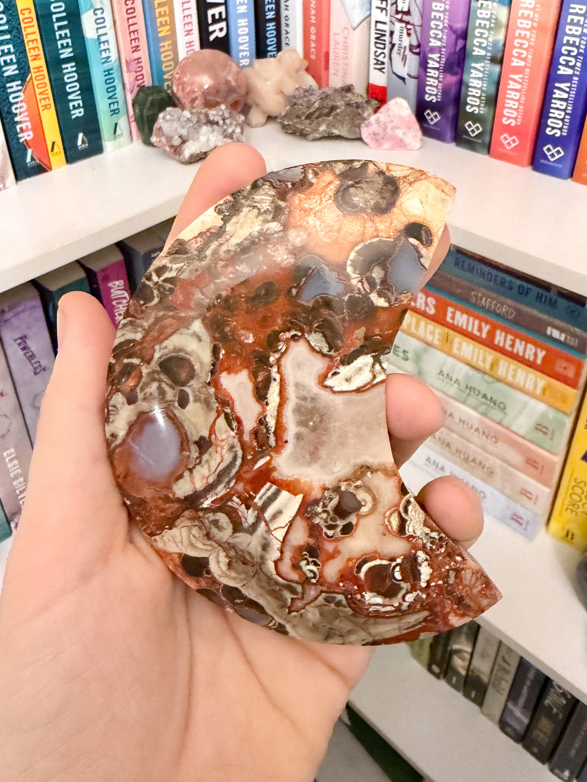 this money agate moon is 8.6 ounces and 4 1/4 inches tall. it’s so gorgeous with its orange and brown coloring.