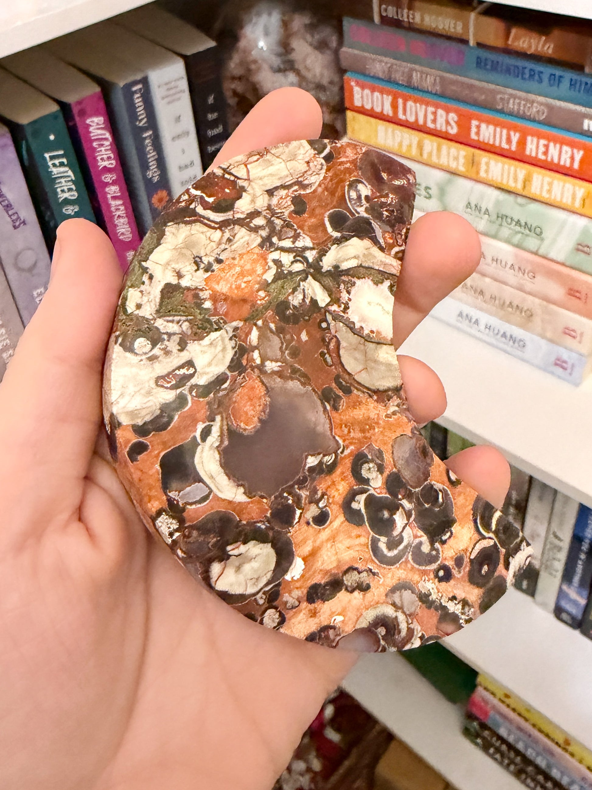 this money agate moon is 7.7 ounces and 4 1/4 inches tall. it’s so gorgeous with its orange and brown coloring. the banding and pattern on this one reminds me of a cheetah.