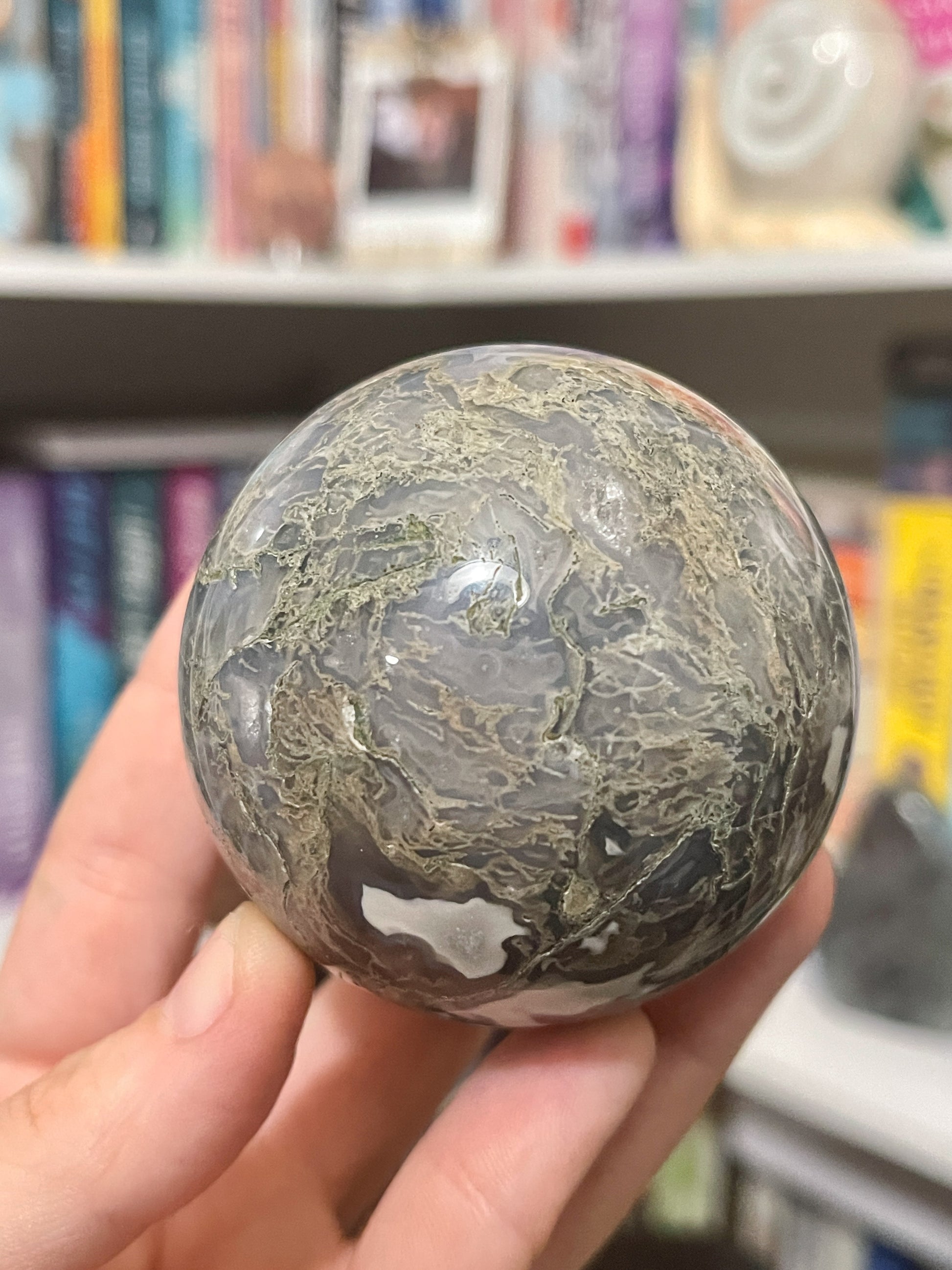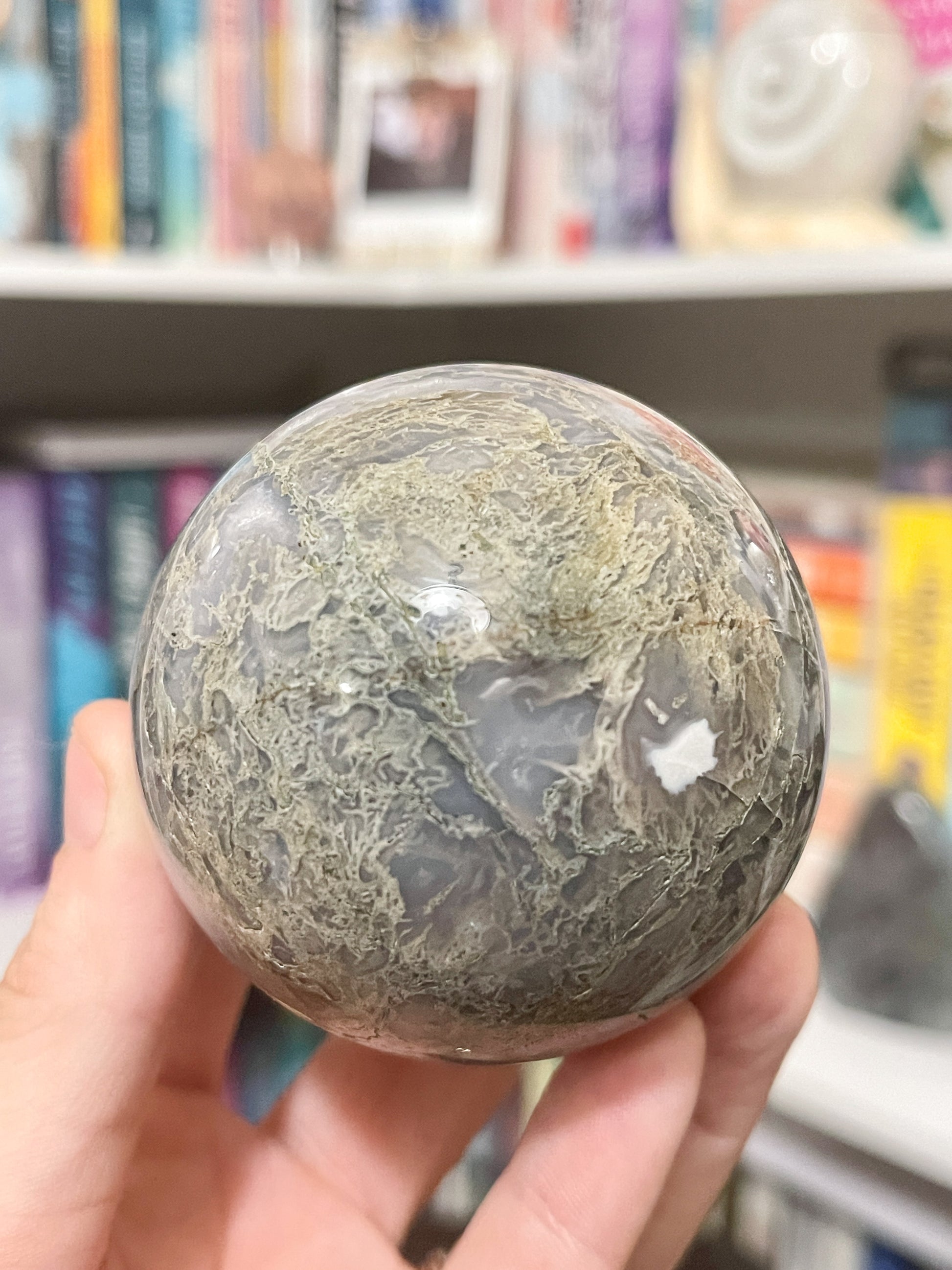 this moss agate sphere has an entire fairy garden in it and you can’t change my mind. it’s stunning, green, white and just so so gorgeous. everything a moss agate should be and more.